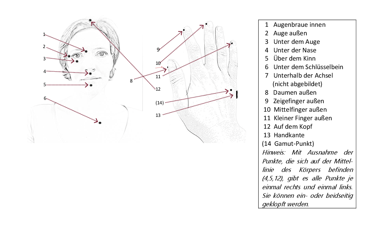 - Weitere Klopfsequenz: Die Punkte 1-12 nacheinander klopfen und dabei jeweils das (restliche) Problem ansprechen (z.B. „Meine restliche Angst“ oder „Der Rest Wut auf…“).